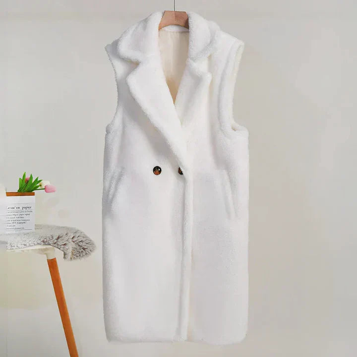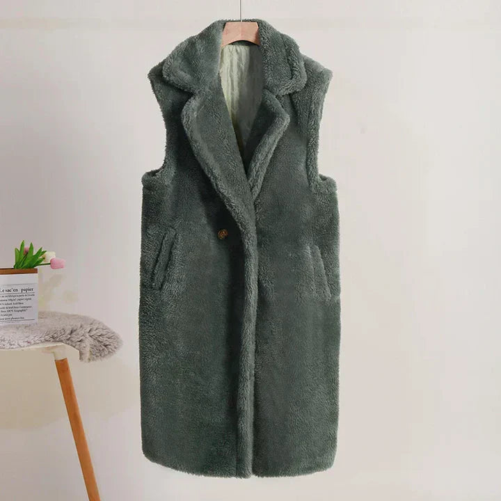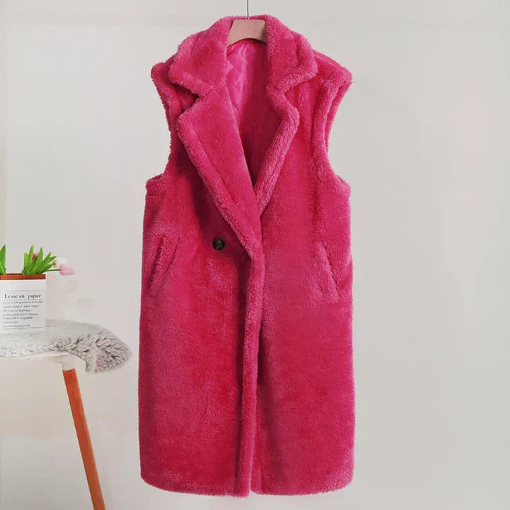 Cappotto senza maniche da donna – Vestibilità oversize – Effetto peluche – Collo a tacca – Lunghezza media