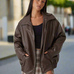 Scopri un look chic e disinvolto con il nostro **Set Raffinato Giacca in Pelle Marrone e Minigonna Scozzese**: un perfetto mix di comfort e stile di tendenza.