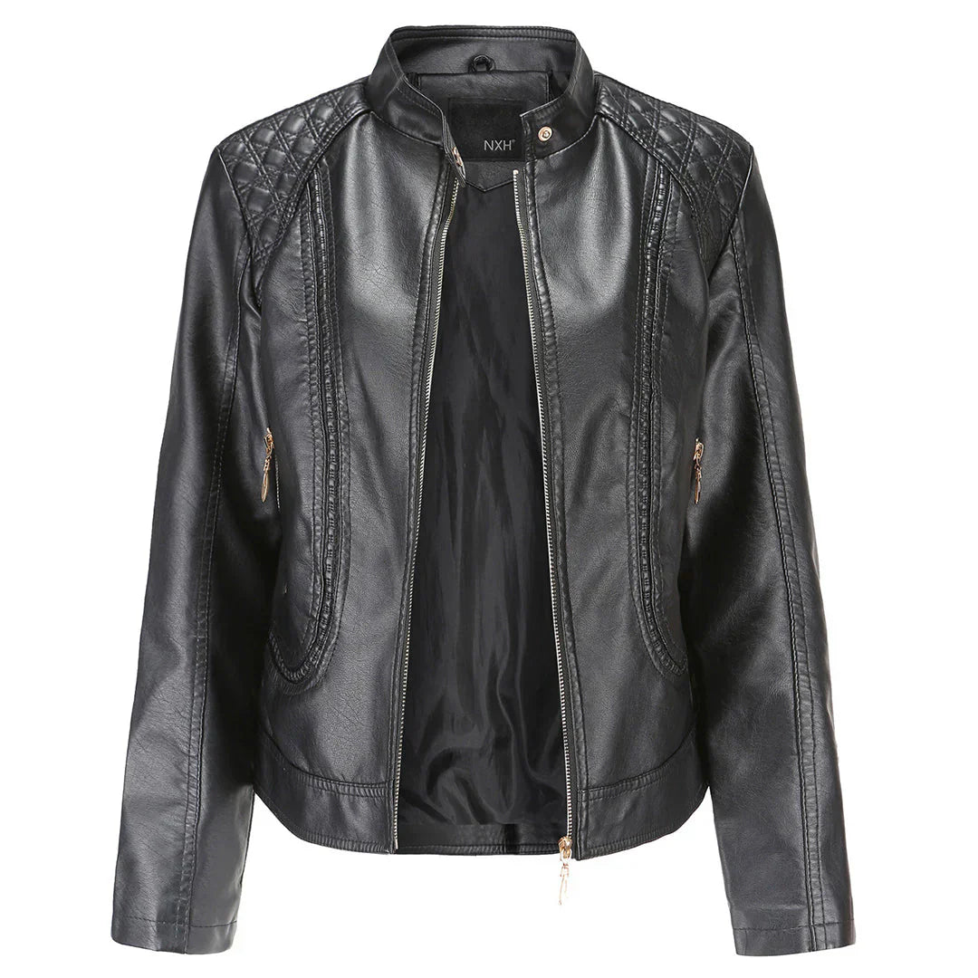 Giacca in pelle da donna – Vestibilità slim – Spalle imbottite – Collo alto – Tasche con cerniera