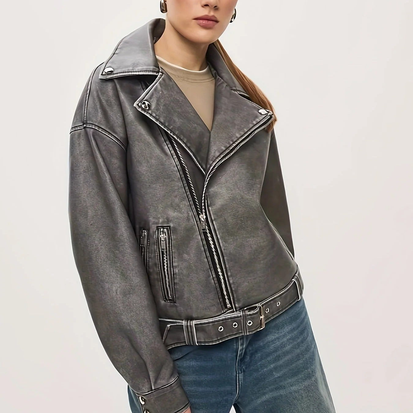 Giacca in pelle da donna – Vestibilità oversize – Stile biker – Cintura in vita – Dettagli argento