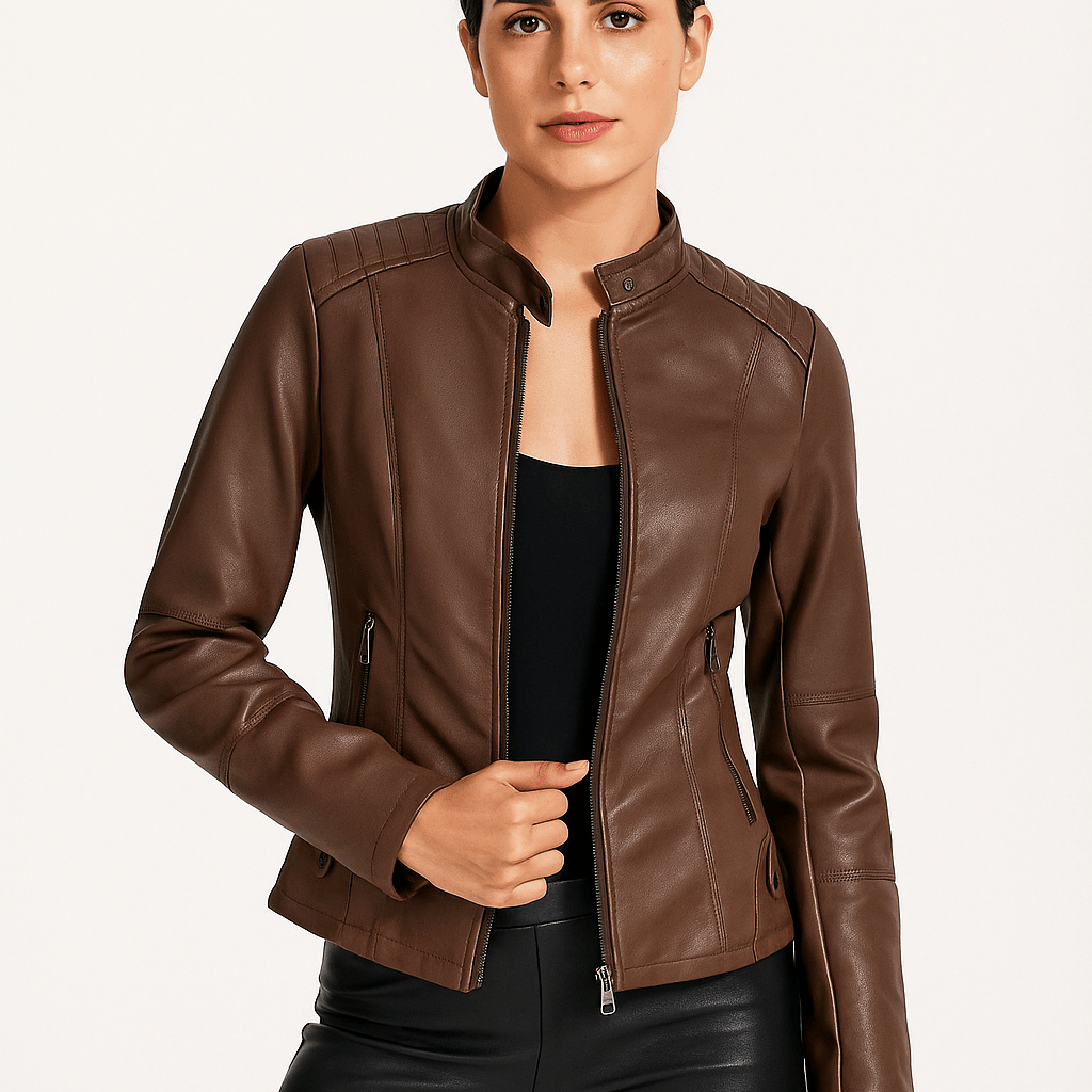 Giacca in pelle da donna – Taglio aderente – Collo dritto – Maniche lunghe – Tasche con cerniera