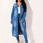 Giacca lunga in denim dalla vestibilità comoda, realizzata in tessuto con dettagli effetto consumato e lunghezza alla caviglia.