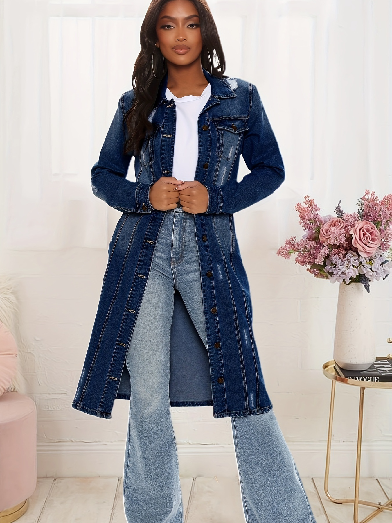Questa giacca lunga in denim completa un outfit casual. Si abbina facilmente a capi di tutti i giorni per uno stile deciso.