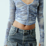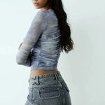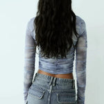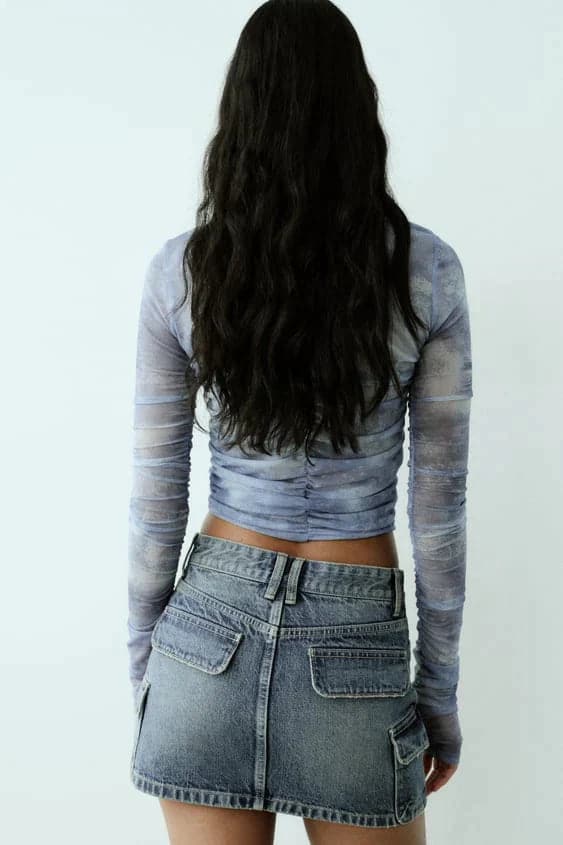 Il top presenta un'esclusiva stampa ispirata alle nuvole, maniche lunghe e una cerniera frontale per un tocco moderno e una vestibilità facile. Con un classico design a vita alta, la minigonna è realizzata in denim resistente con delicati dettagli sbiaditi e baffati per un'estetica di ispirazione vintage.