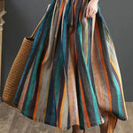 Gonna midi a trapezio da donna – Stampa a righe retrò – Plissettata – Fibre naturali – Abbigliamento casual