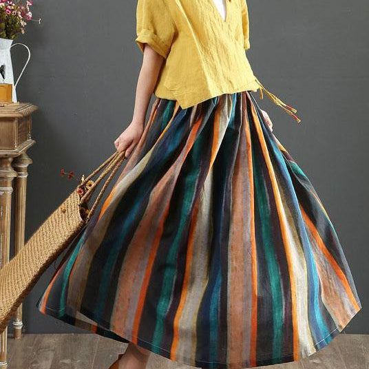 Gonna midi a trapezio da donna – Stampa a righe retrò – Plissettata – Fibre naturali – Abbigliamento casual