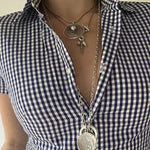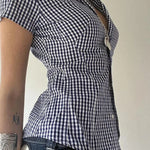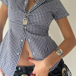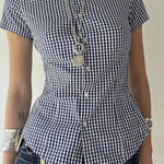 Camicetta aderente a maniche corte con colletto polo a quadri blu