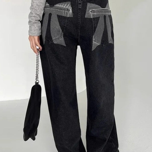 Jeans a gamba larga con tasca e stampa fiocco lavato