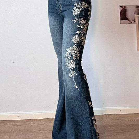 Jeans bootcut con ricamo vintage a rosa sfumata