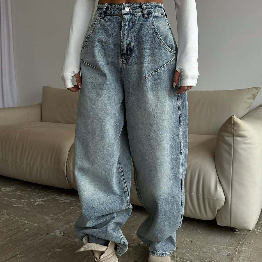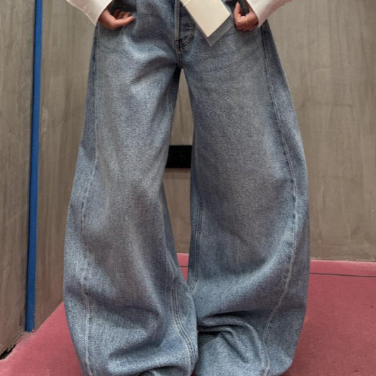 Jeans larghi con gamba curva e lettere in rilievo lavati