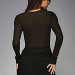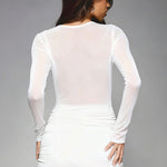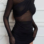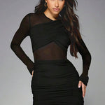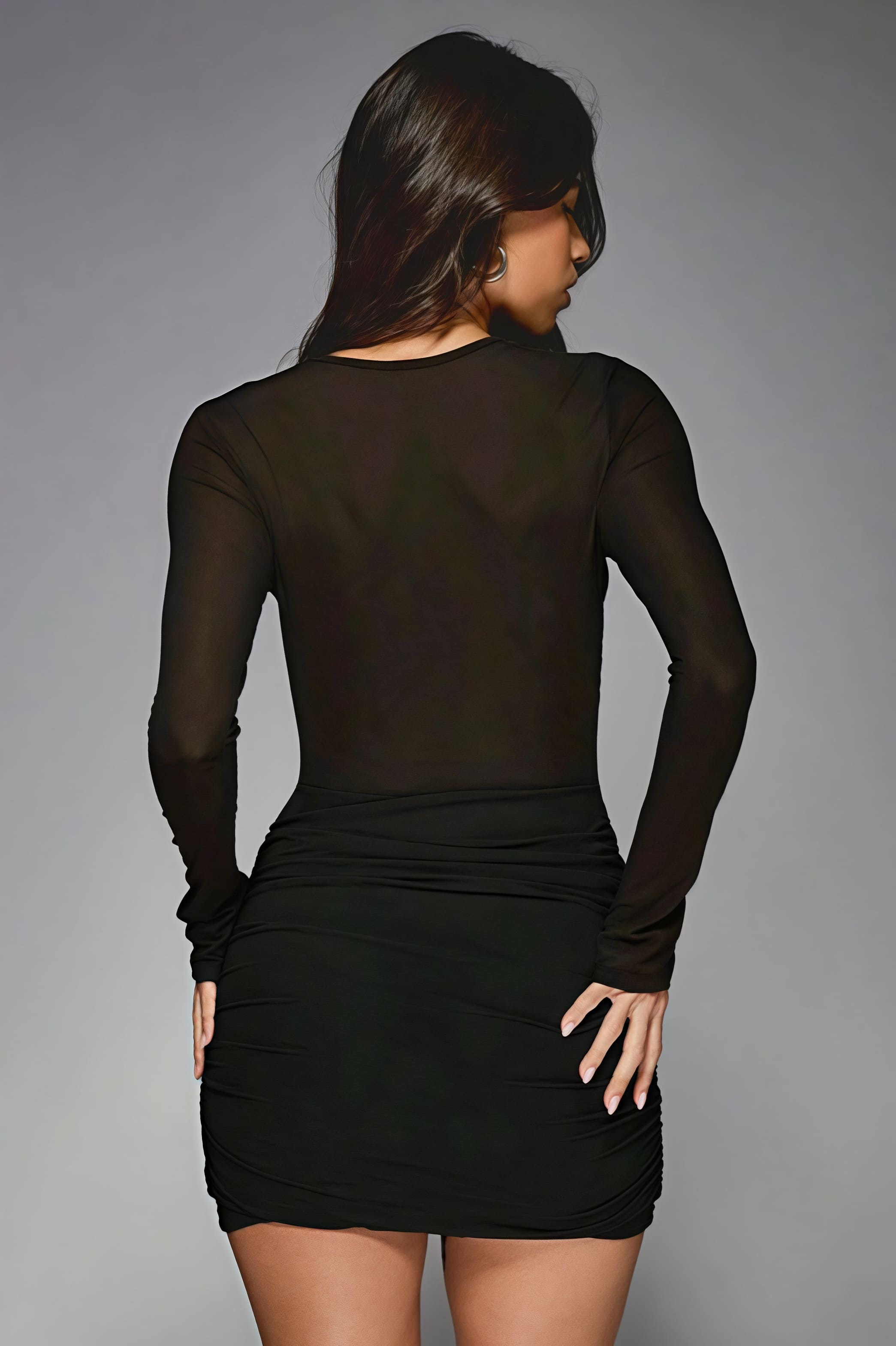 Mini abito a maniche lunghe in rete trasparente con patchwork arricciato