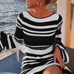 Mini abito a righe in maglia con schiena scoperta e maniche a campana annodate