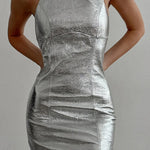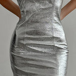 Mini abito aderente con scollo rotondo in similpelle futuristica color argento