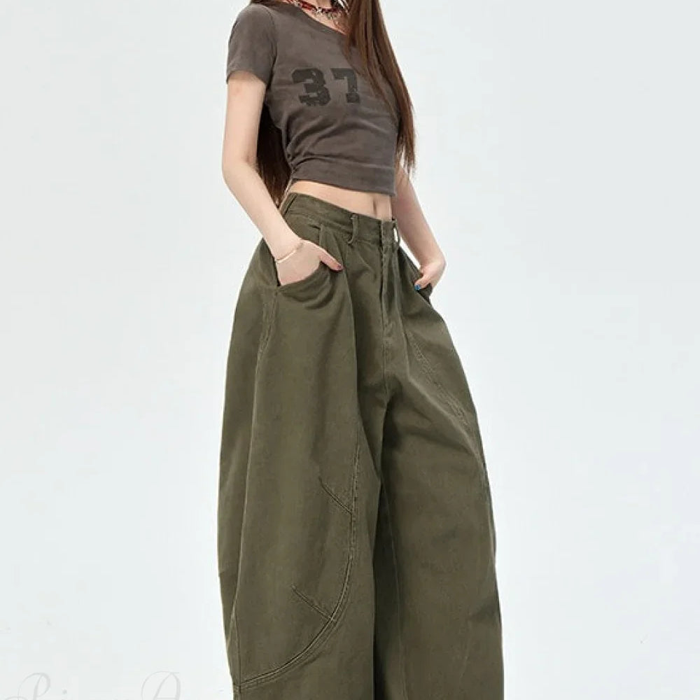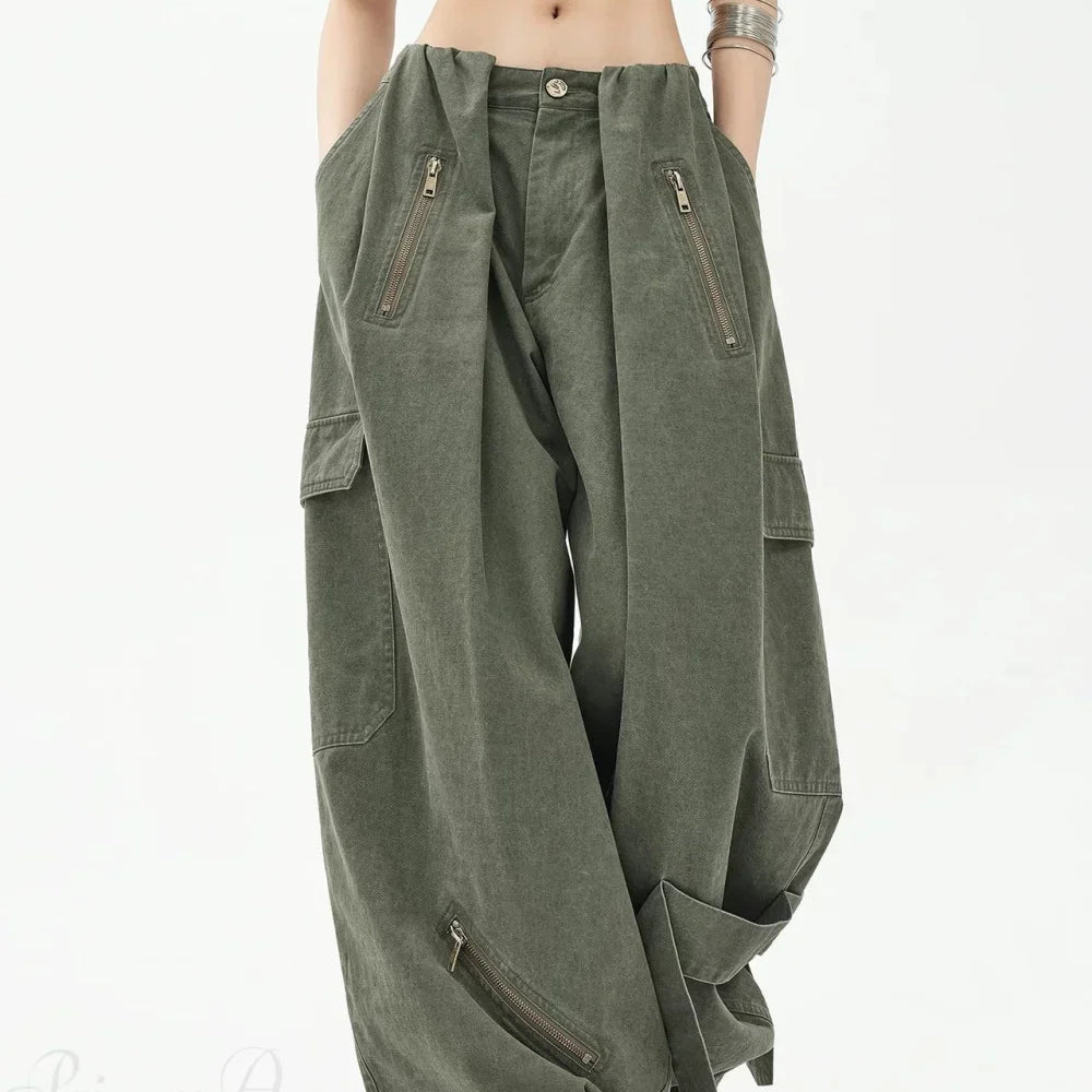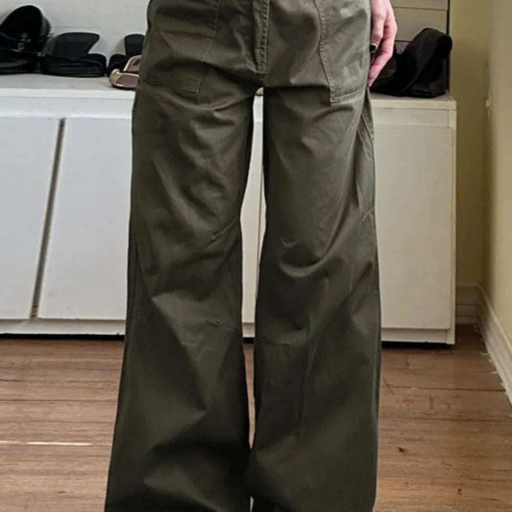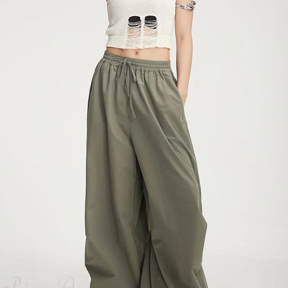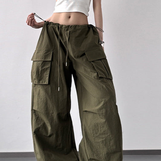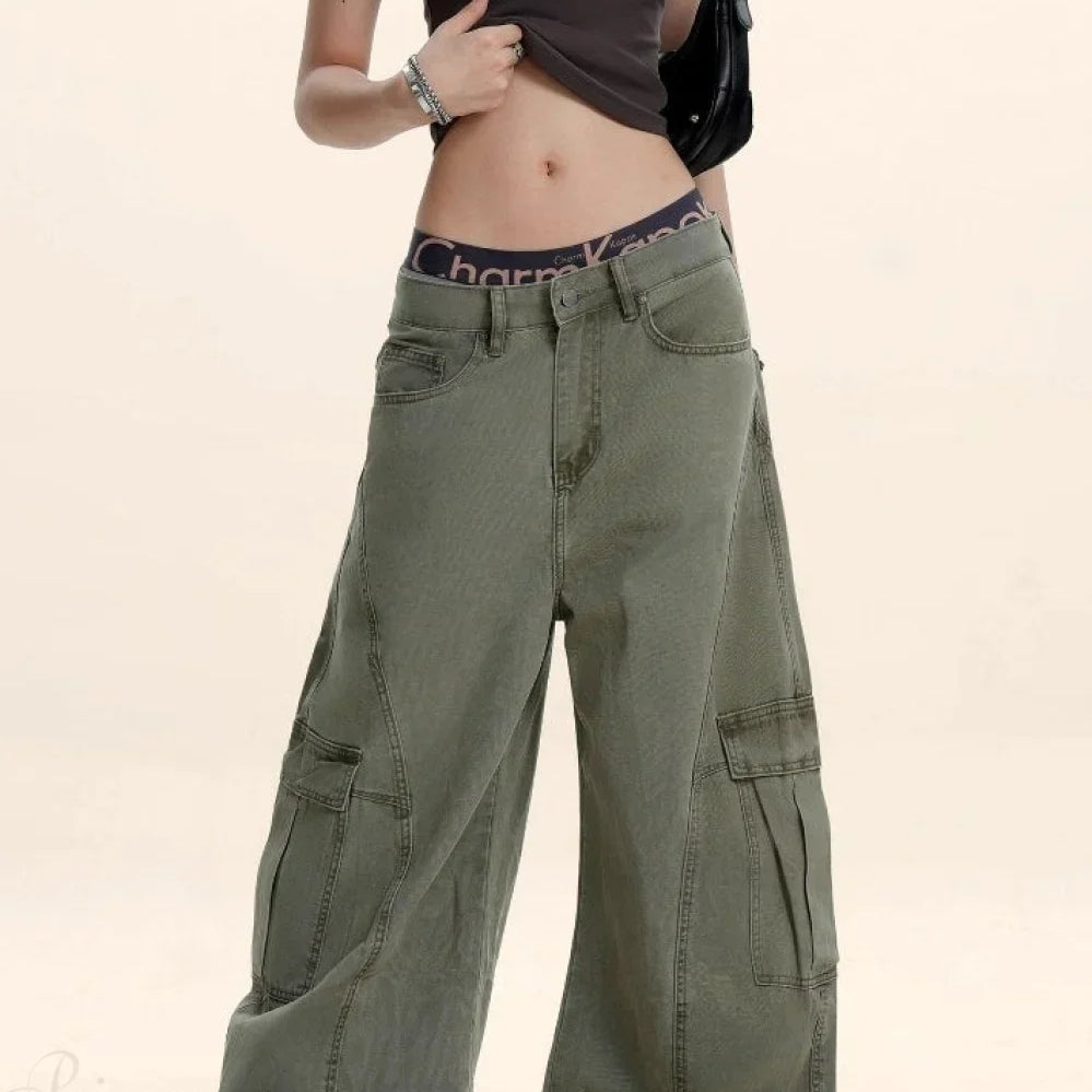 Pantaloni cargo larghi a vita alta stile paracadute verde militare