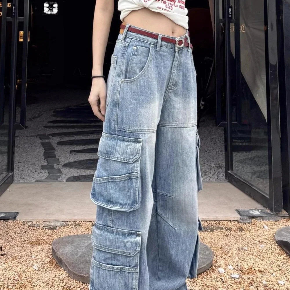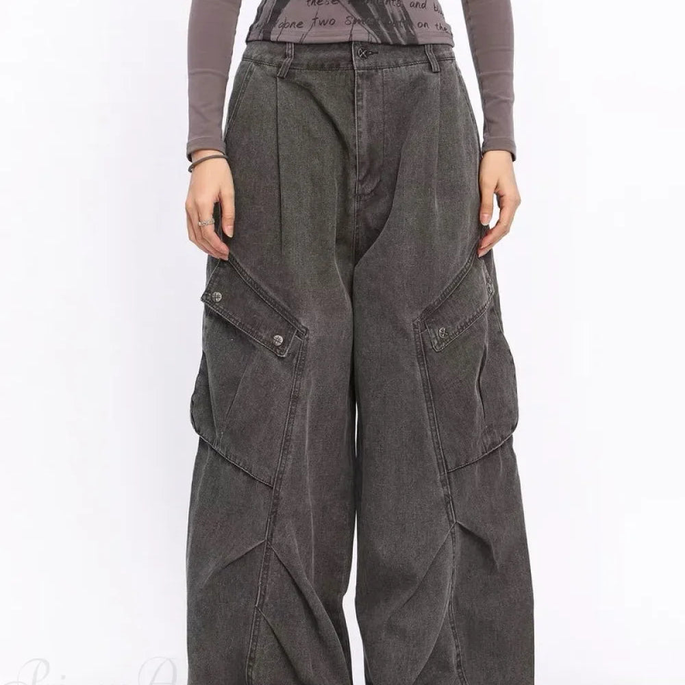 Pantaloni cargo a gamba larga con tasche grandi in denim