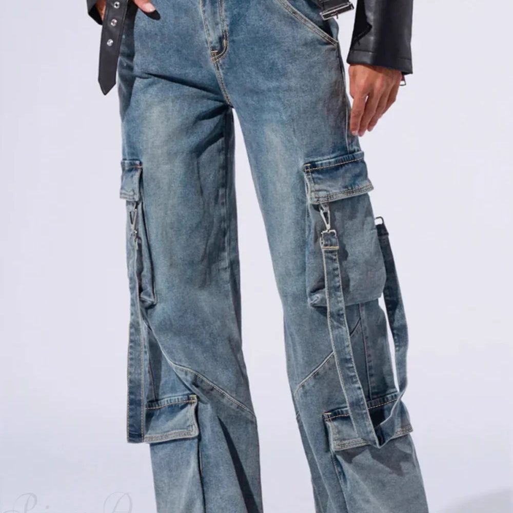 Pantaloni cargo svasati a vita alta con tasche multiple in denim