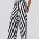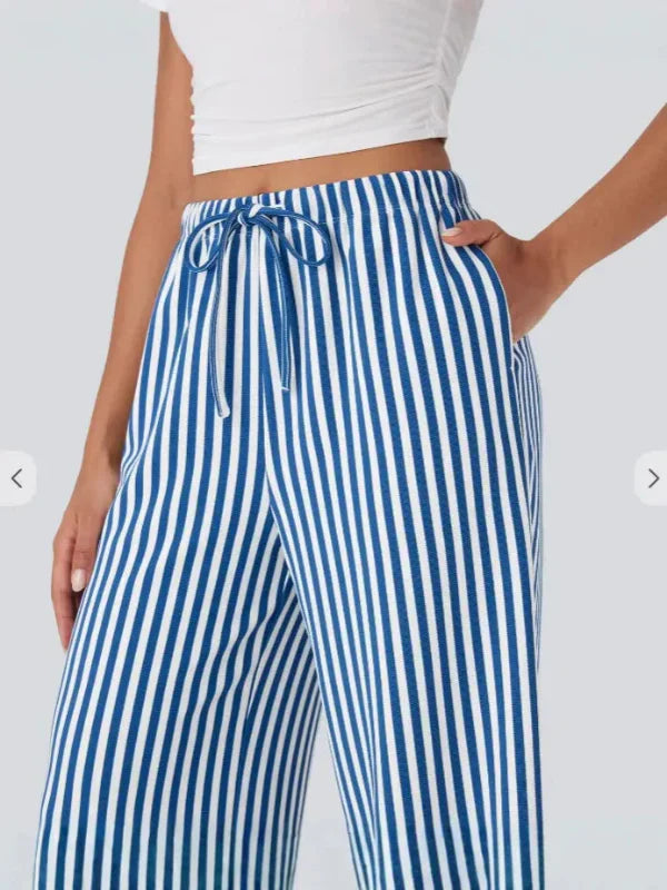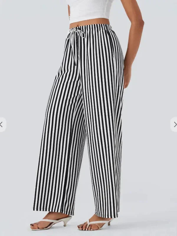 Pantaloni larghi da donna – Vita alta – Lino leggero – A righe – Coulisse regolabile
