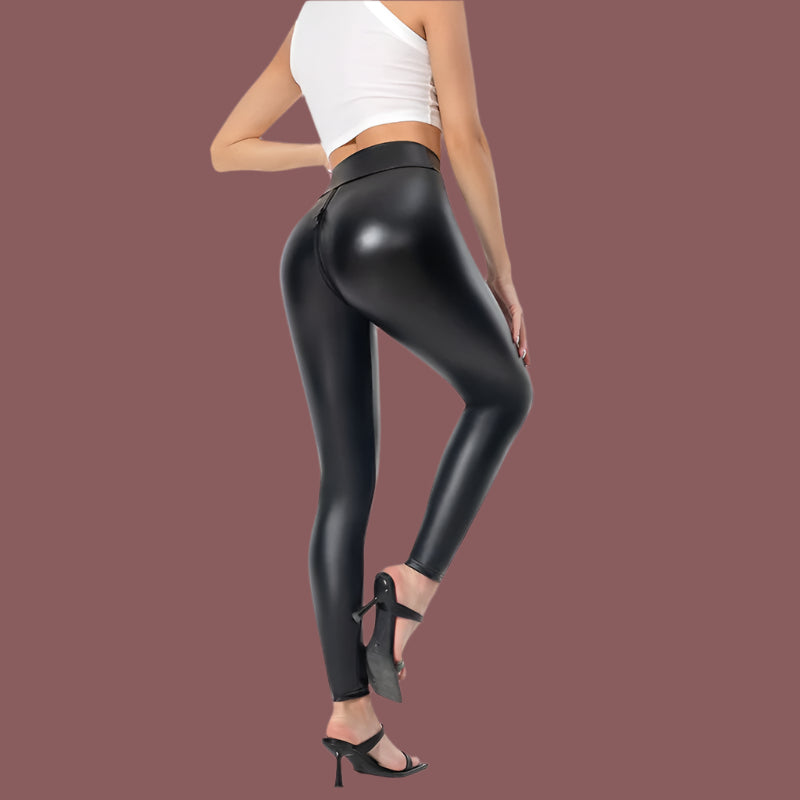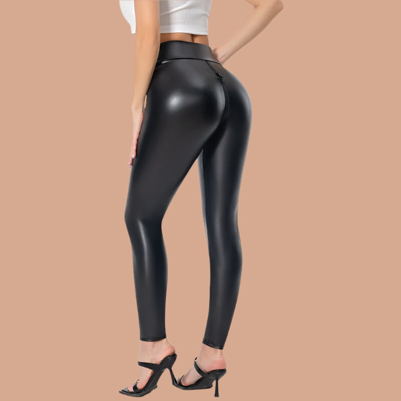 Pantaloni da donna – Pelle sintetica liscia – Vestibilità slim – Cintura liscia – Chiusura frontale con zip