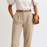 - Design: Vita alta, vestibilità dritta e affusolata con semplici pieghe sul davanti.