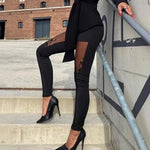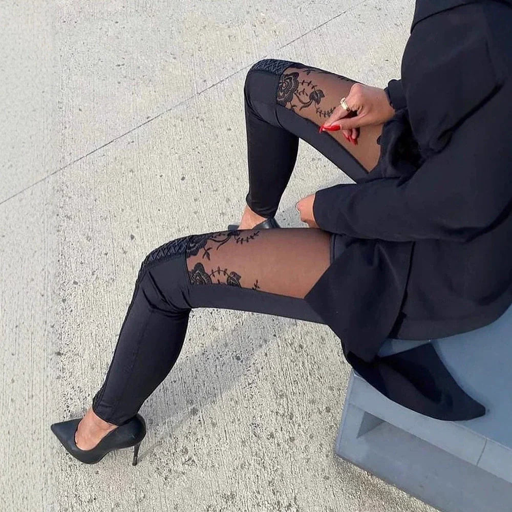 Questi pantaloni da donna presentano una vestibilità slim in tessuto elasticizzato, impreziositi da inserti in pizzo floreale.