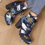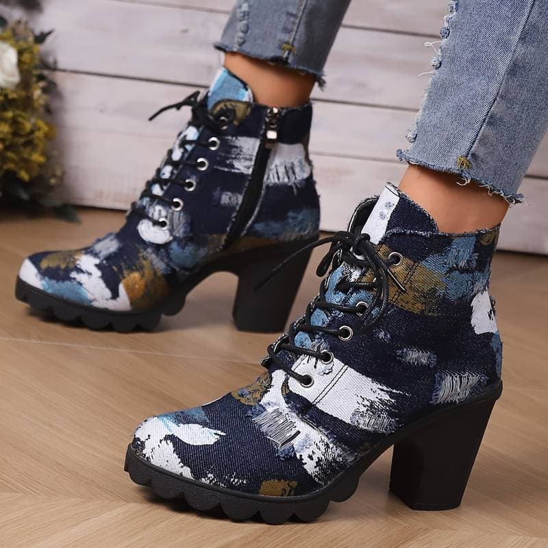 Stivaletti da donna - Tacco a blocco - Lacci e cerniera laterale - Motivo artistico alla moda. Fai colpo con questi stivaletti con tacco a blocco e un motivo artistico alla moda. Comodi e originali, si allacciano con lacci e una cerniera laterale per indossarli e toglierli facilmente.