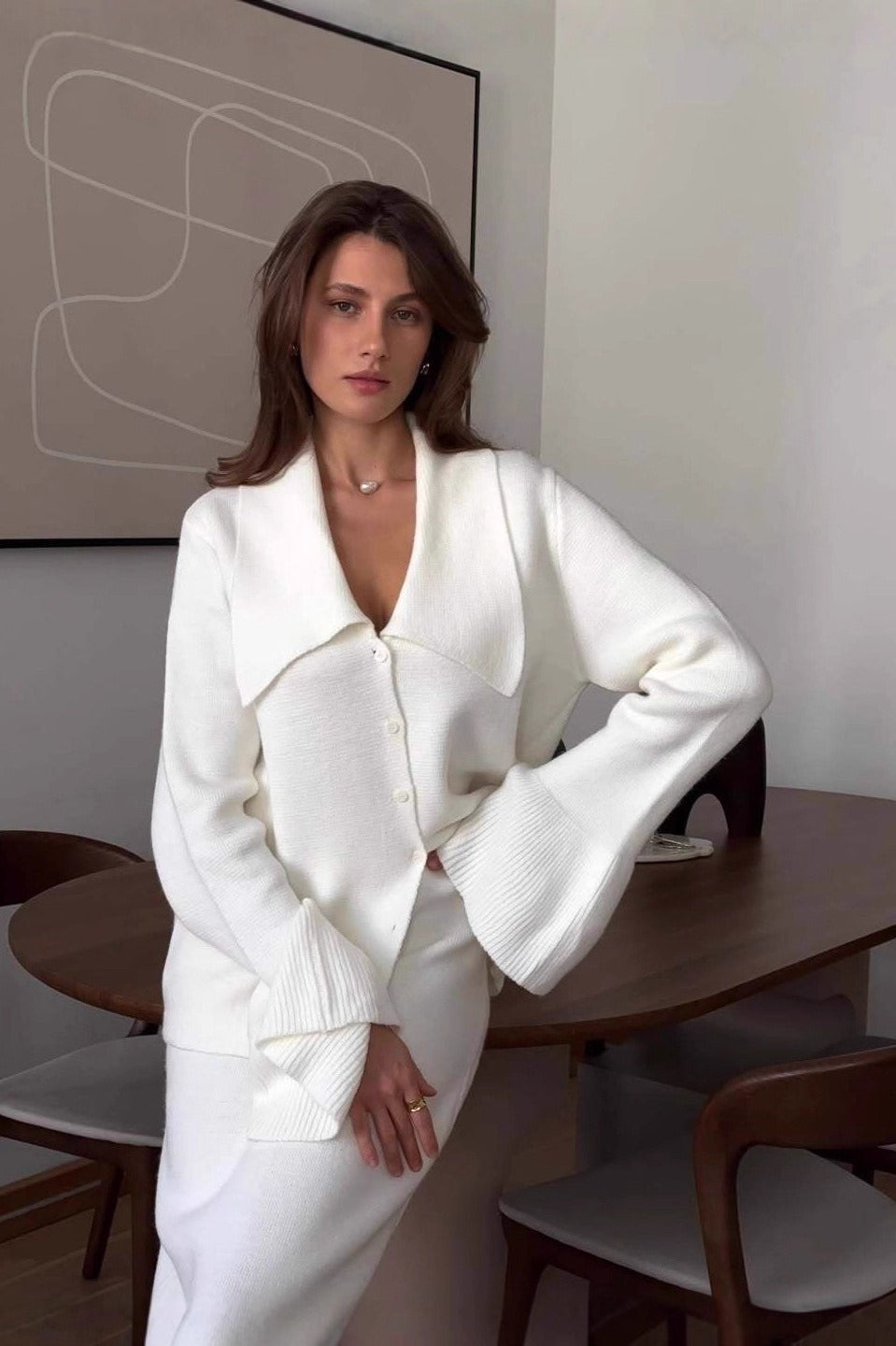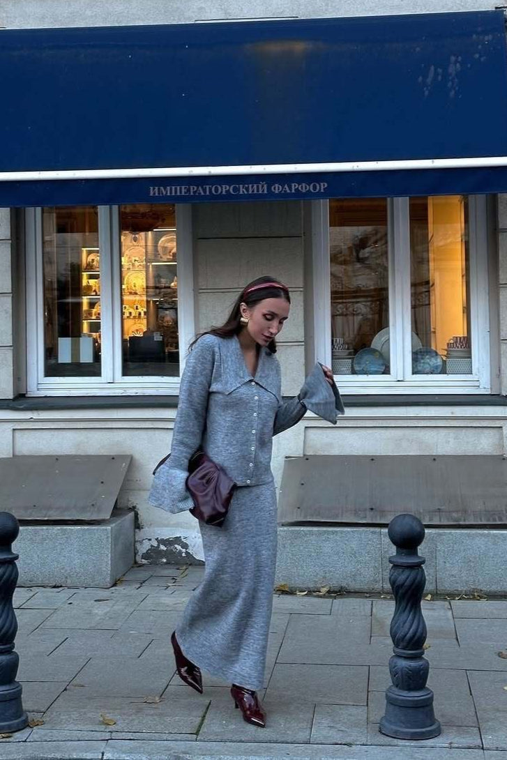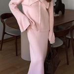 Completo due pezzi con cardigan rosa con maniche a campana e colletto polo e gonna dritta