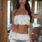 Completo due pezzi sexy in pile con patchwork di paillettes bianche