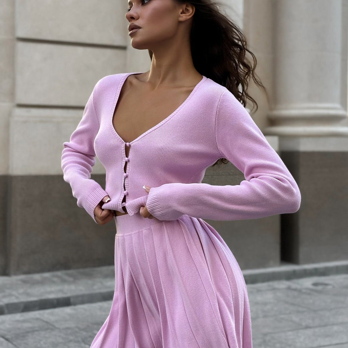 Completo due pezzi sexy in maglia aderente con bottoni, maniche lunghe e vita bassa