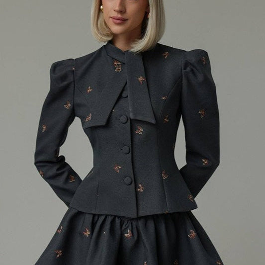 Completo due pezzi con blazer ricamato con cintura in vita e minigonna
