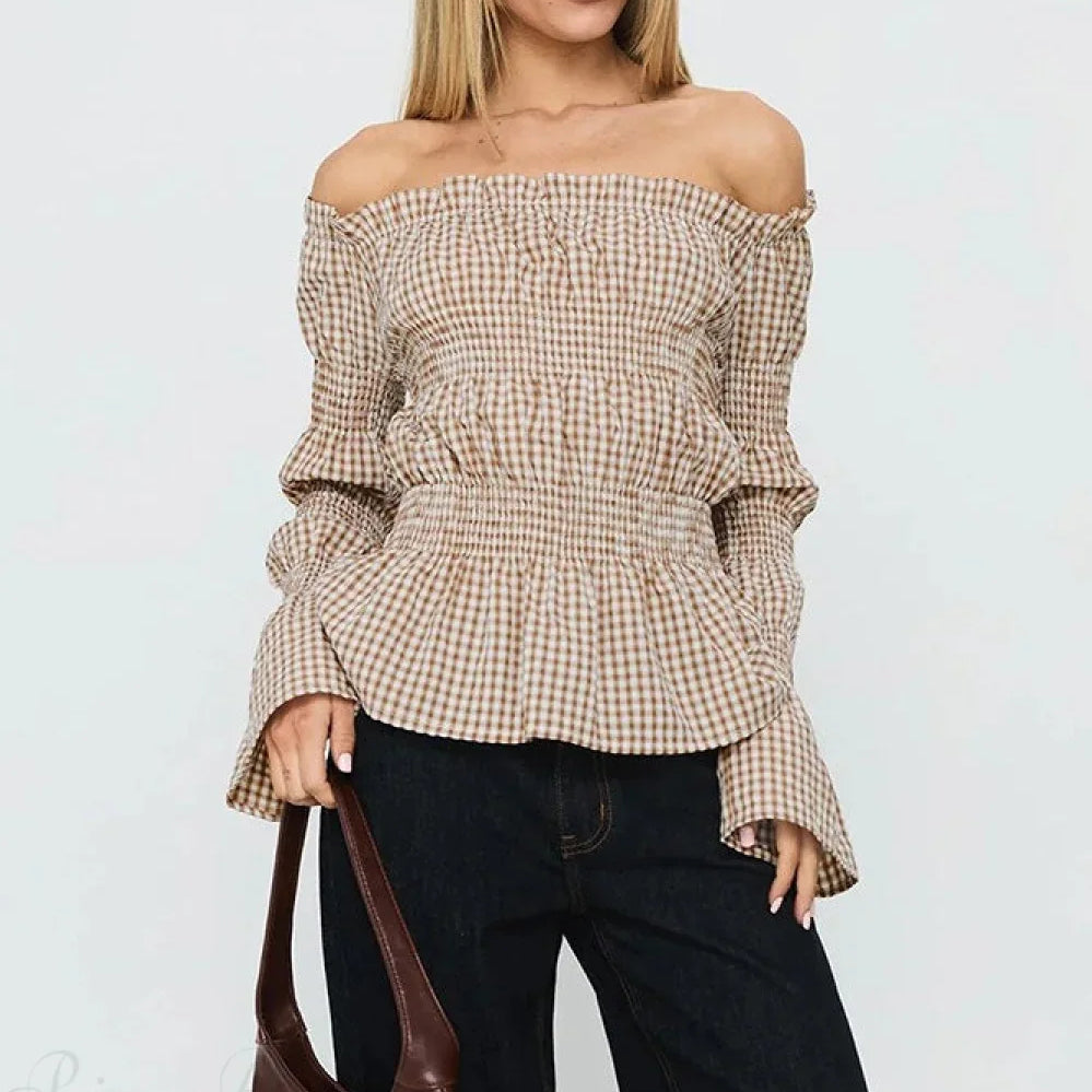 Blusa a maniche lunghe svasate con spalle scoperte e motivo scozzese smocked