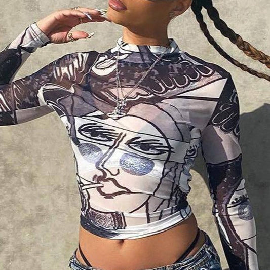 Blusa sexy con stampa a rete trasparente e maniche lunghe e scollo tondo