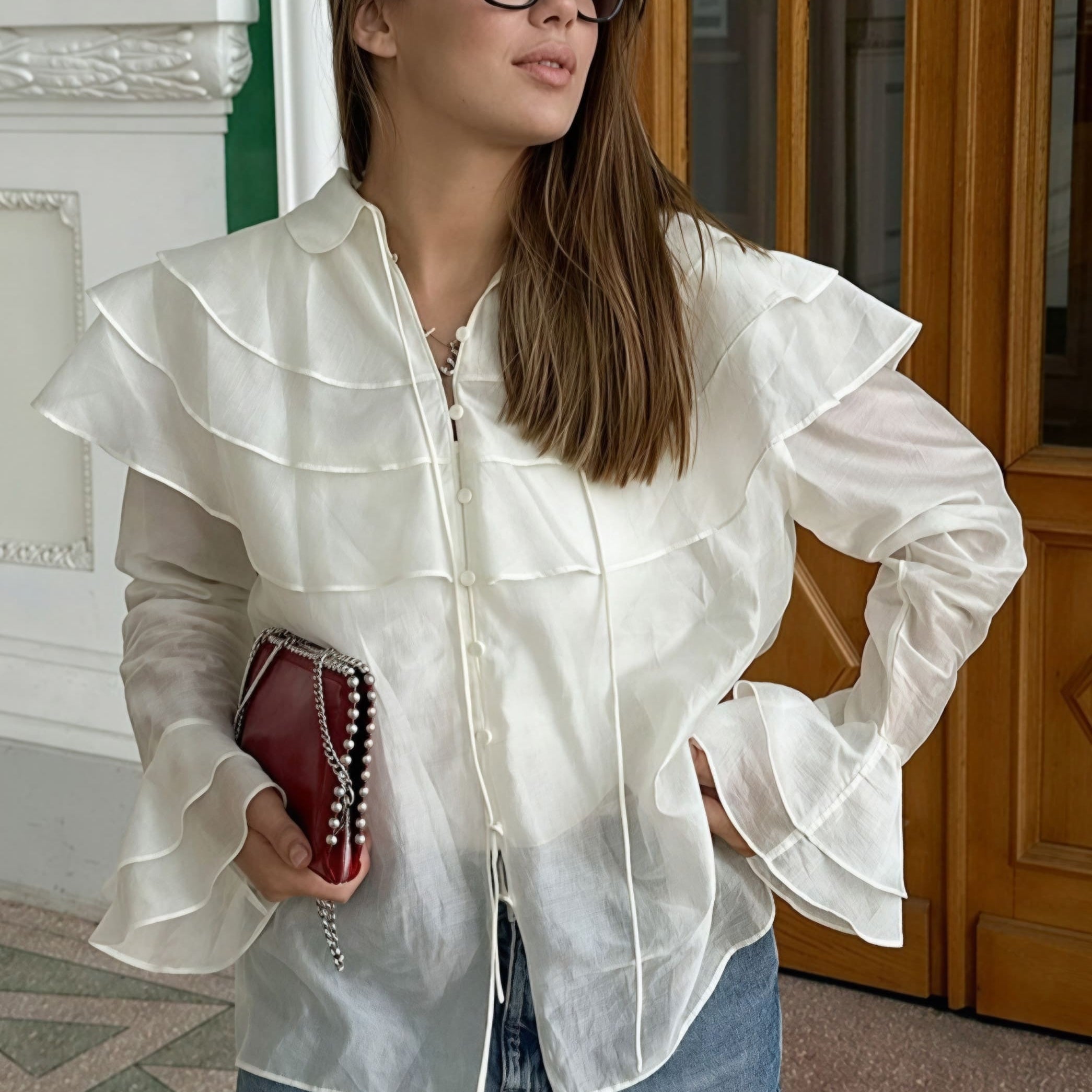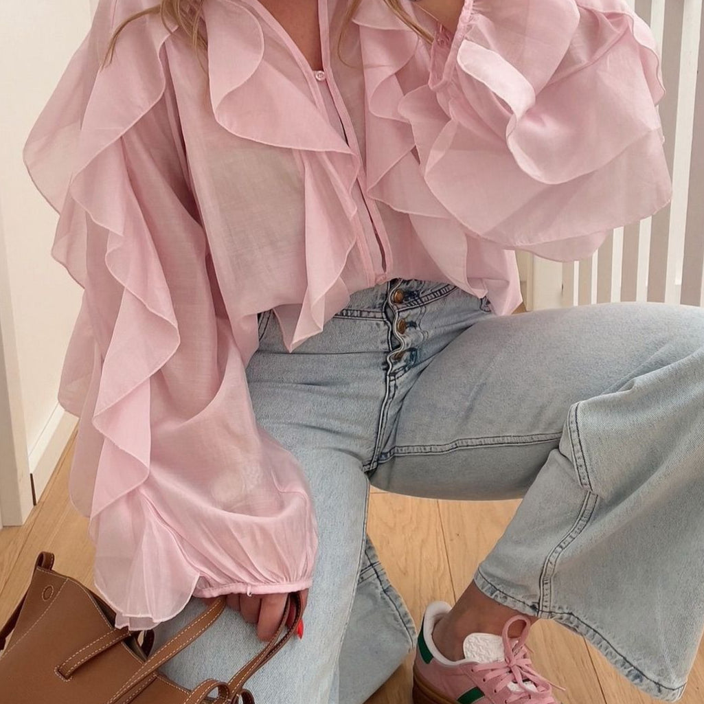 Camicetta in chiffon tencel con maniche svasate e volant