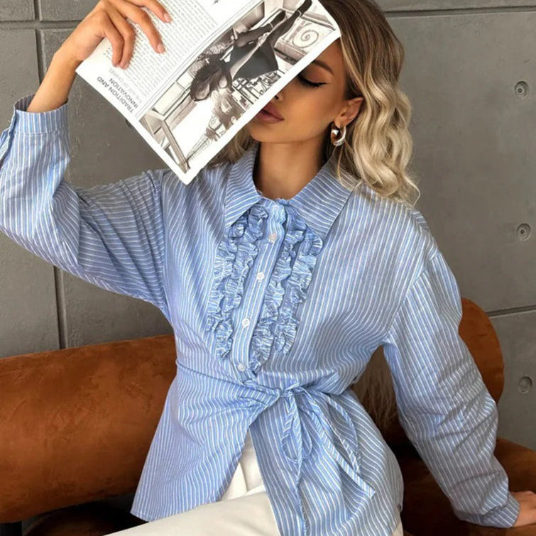 Camicetta a righe con volant e cintura annodata in vita