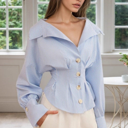 Camicetta a righe con maniche a sbuffo e colletto arricciato