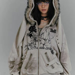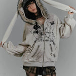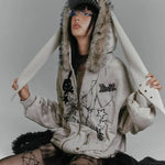 Felpa con cappuccio e stampa orecchie da coniglio con colletto in pile Y2K
