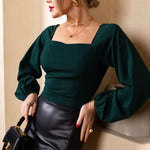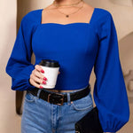 Maglia a maniche lunghe da donna – Vestibilità slim – Tessuto elasticizzato – Scollo squadrato – Spalle a sbuffo