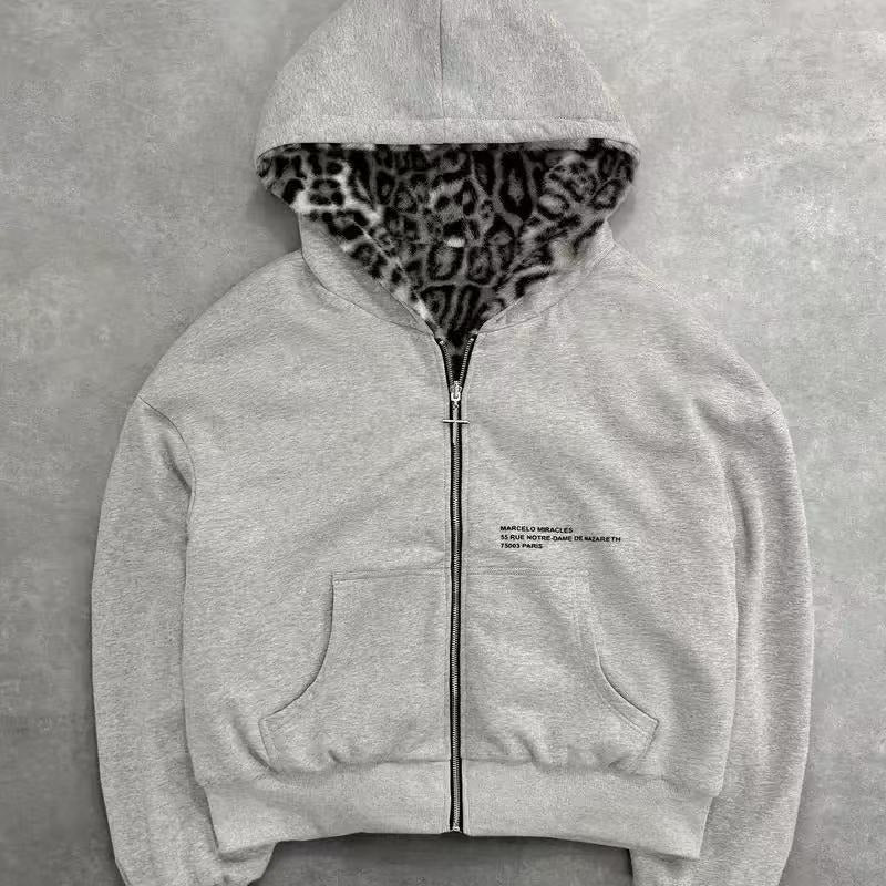 Felpa con cappuccio reversibile con cerniera e stampa leopardata vintage