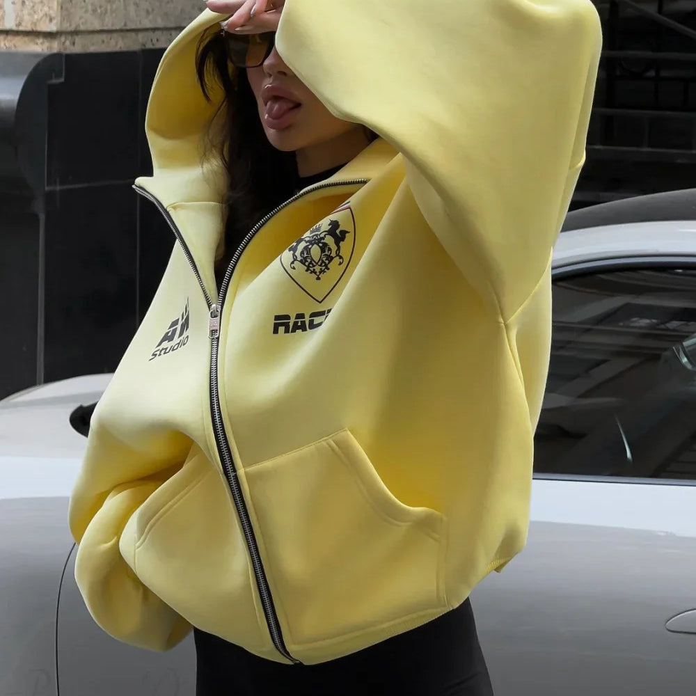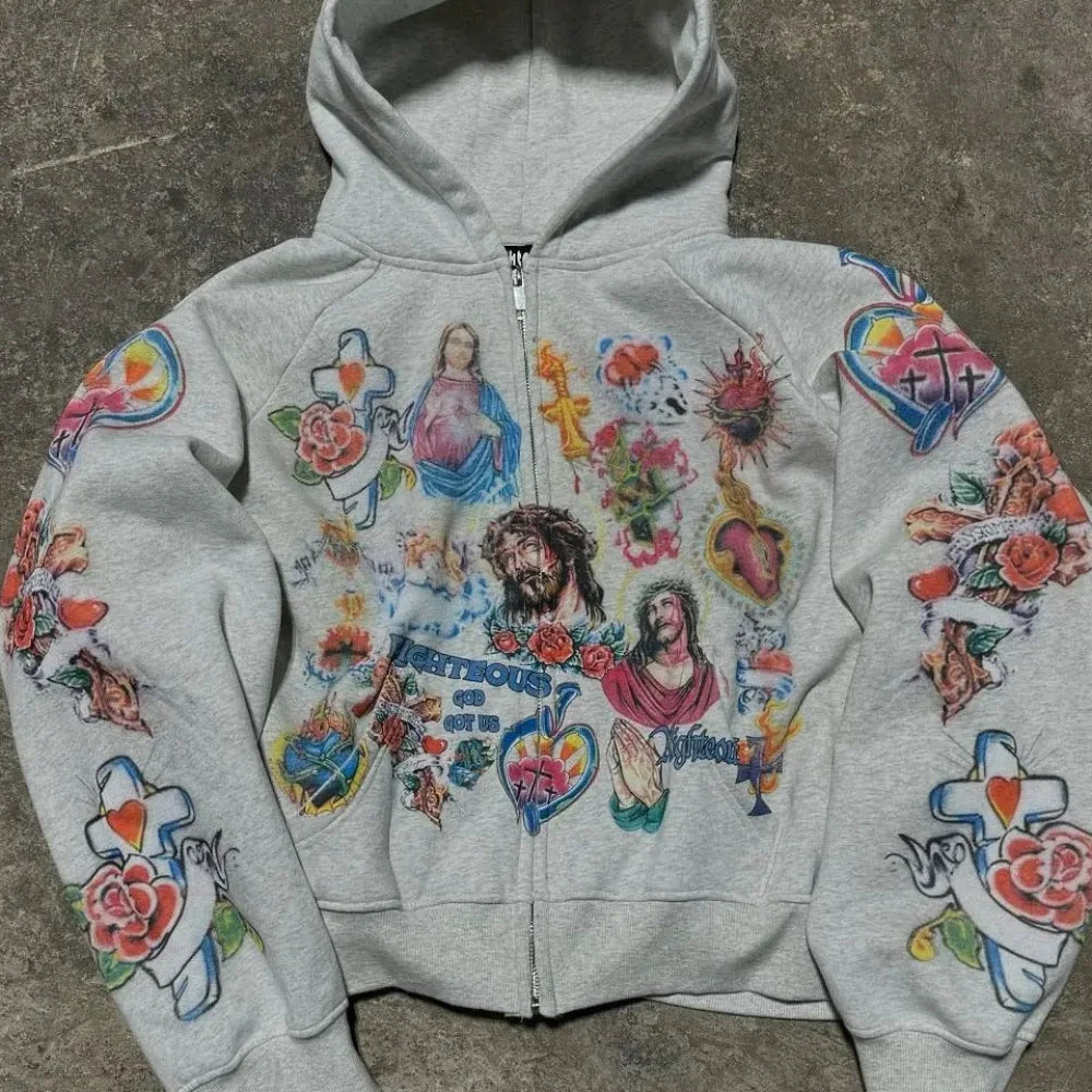Felpa con cappuccio e cerniera retrò Harajuku