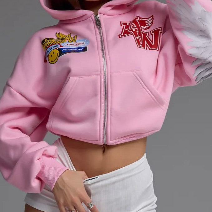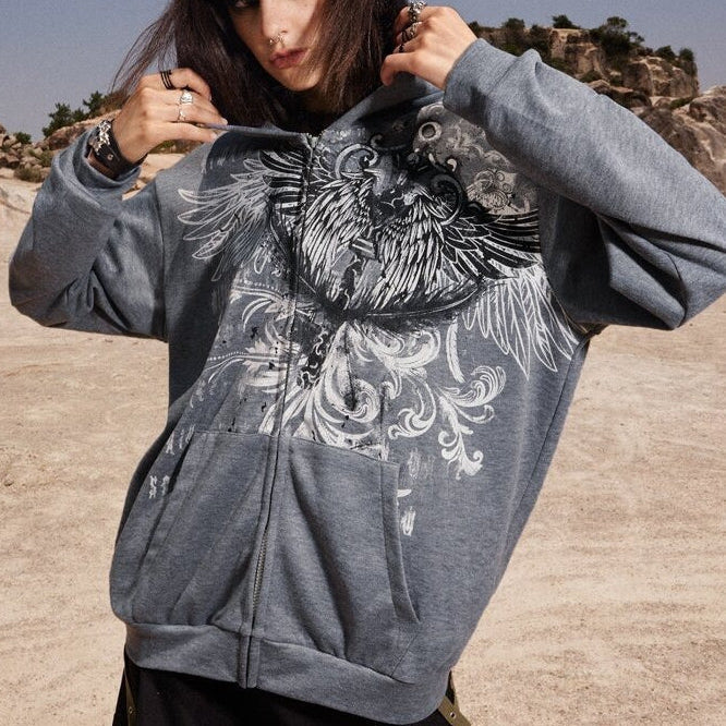 Felpa con cappuccio oversize con stampa angelo casual da strada e cerniera