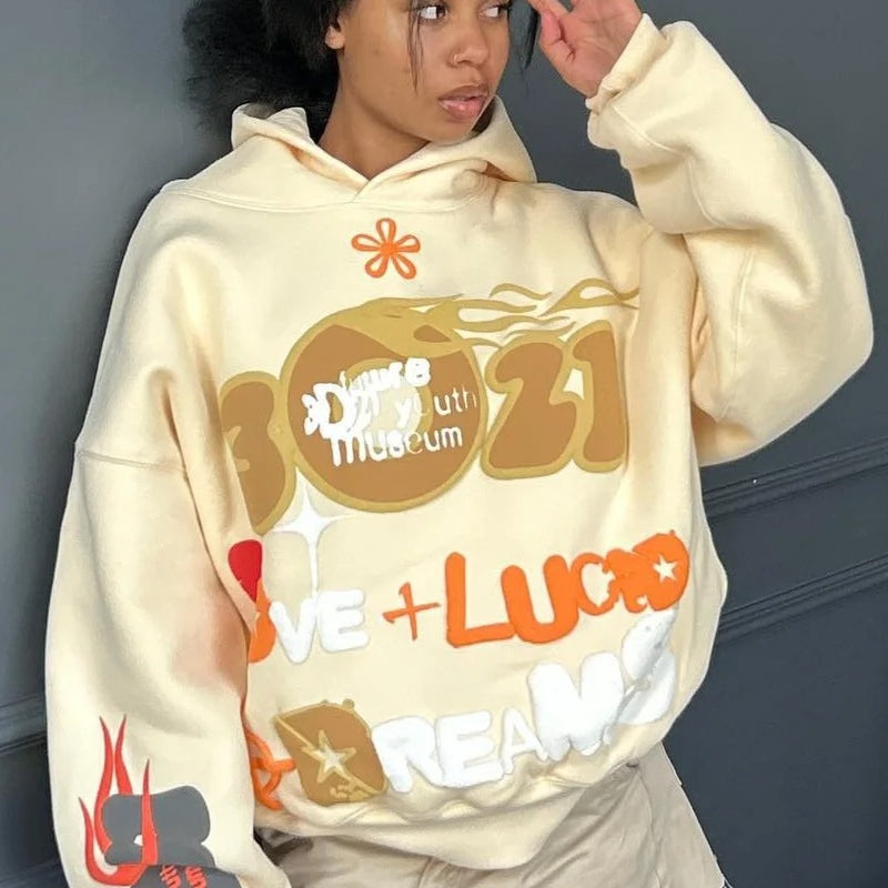 Felpa con cappuccio oversize con stampa a sbuffo e lettere