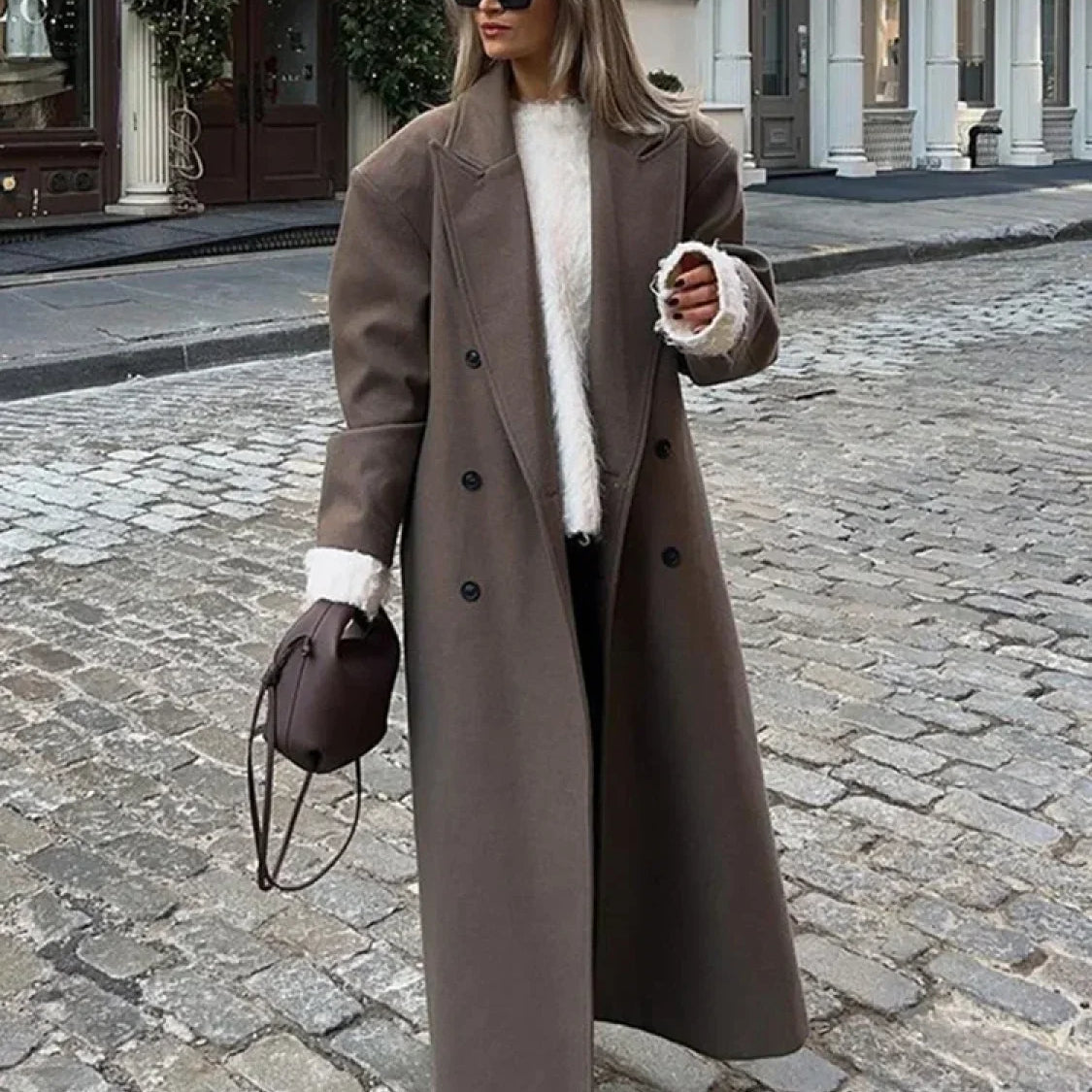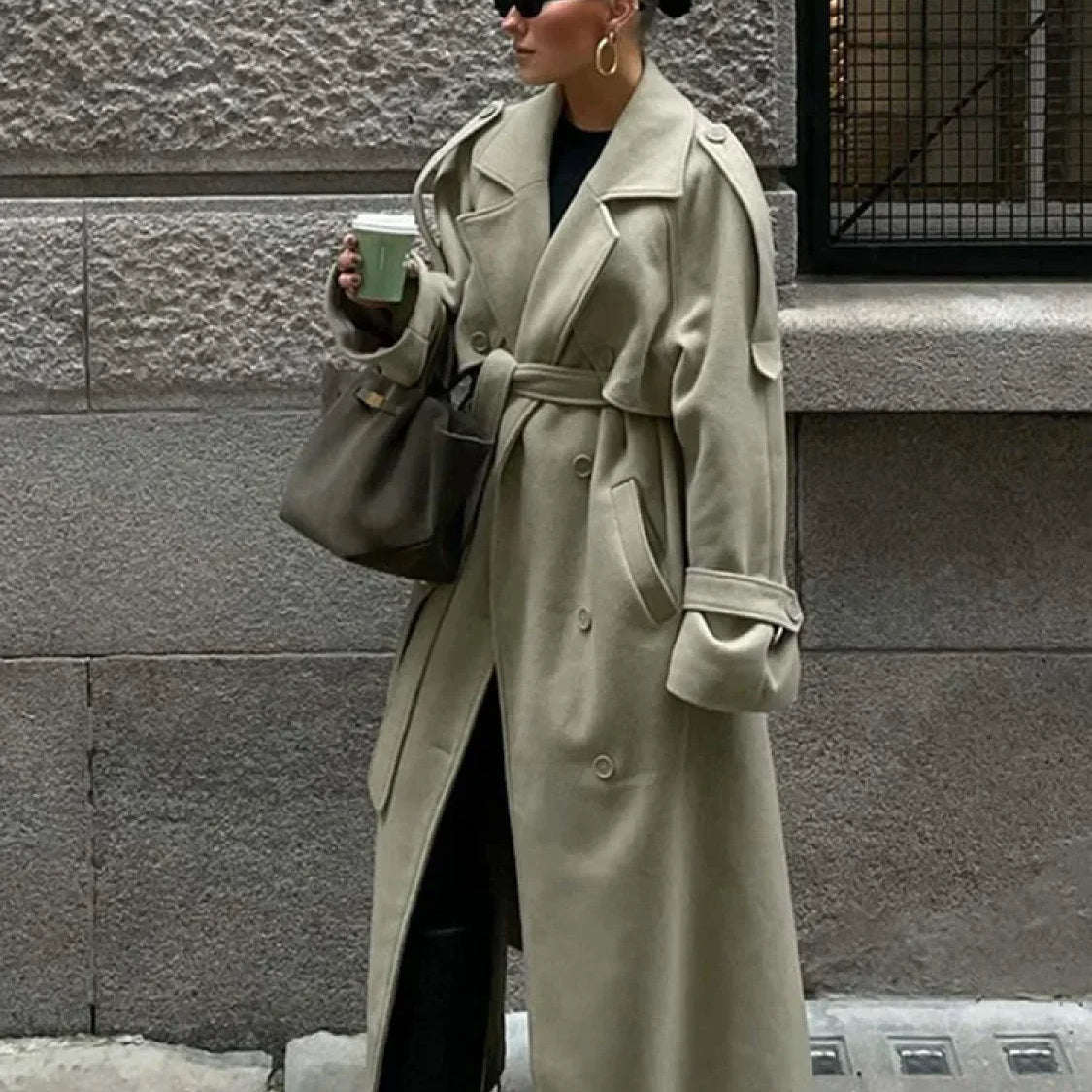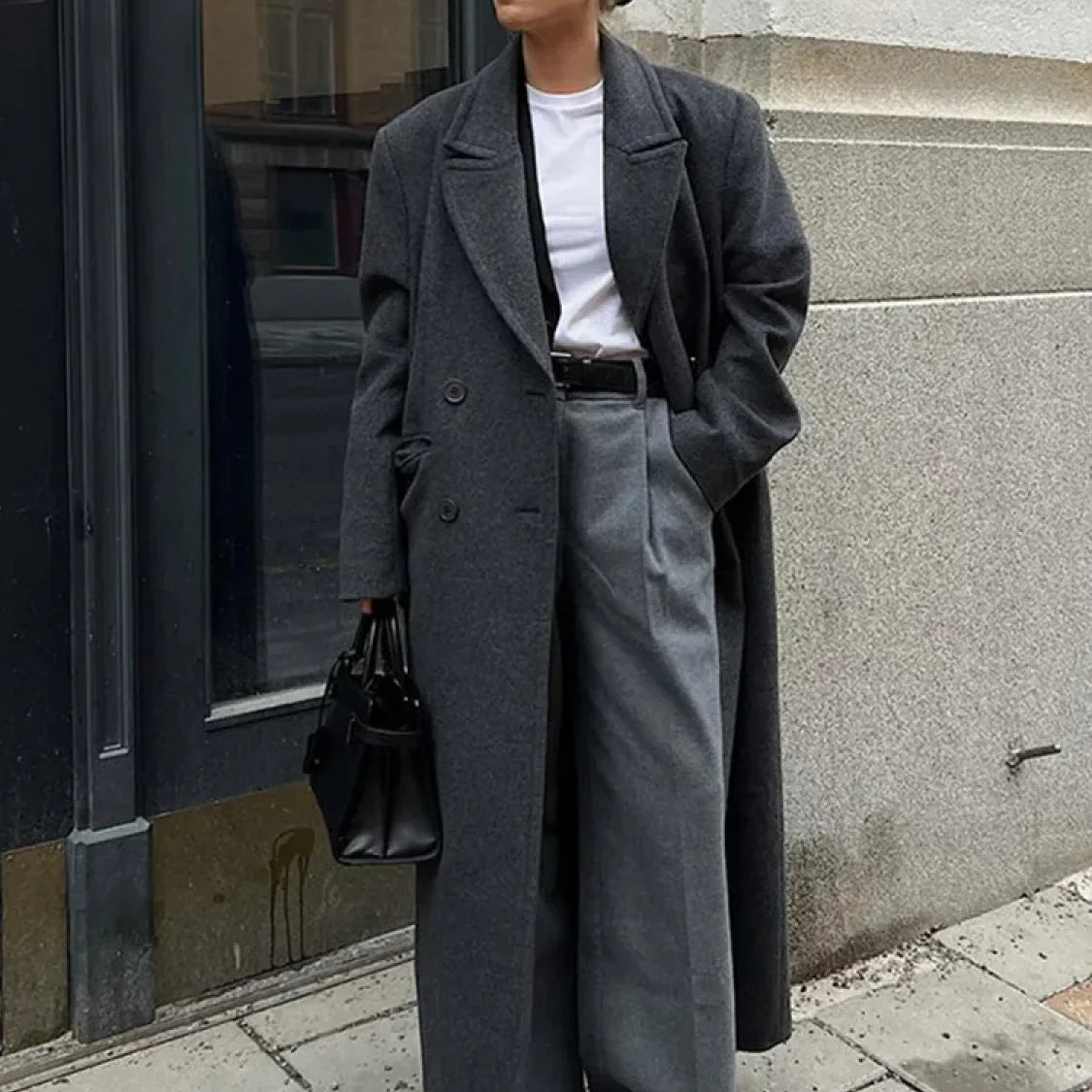 Elegante cappotto lungo in lana con cintura