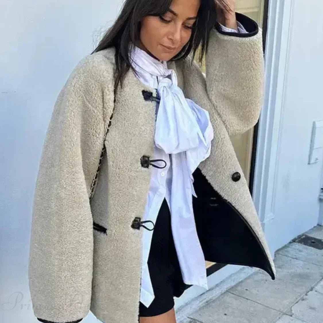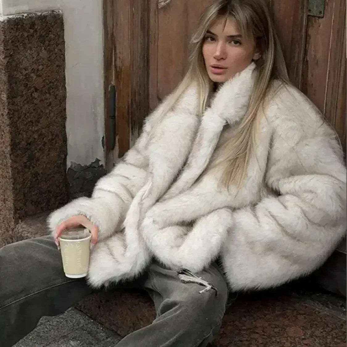 Cappotto corto con revers in pelliccia sintetica soffice