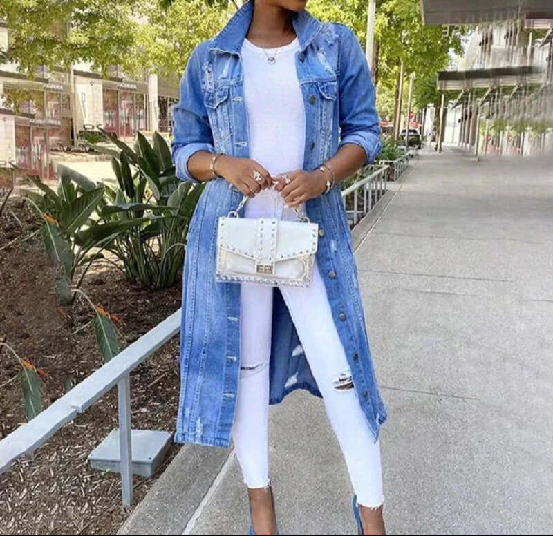 Trench da donna – Taglio dritto e rilassato – Denim – Dettagli rovinati – Lunghezza maxi