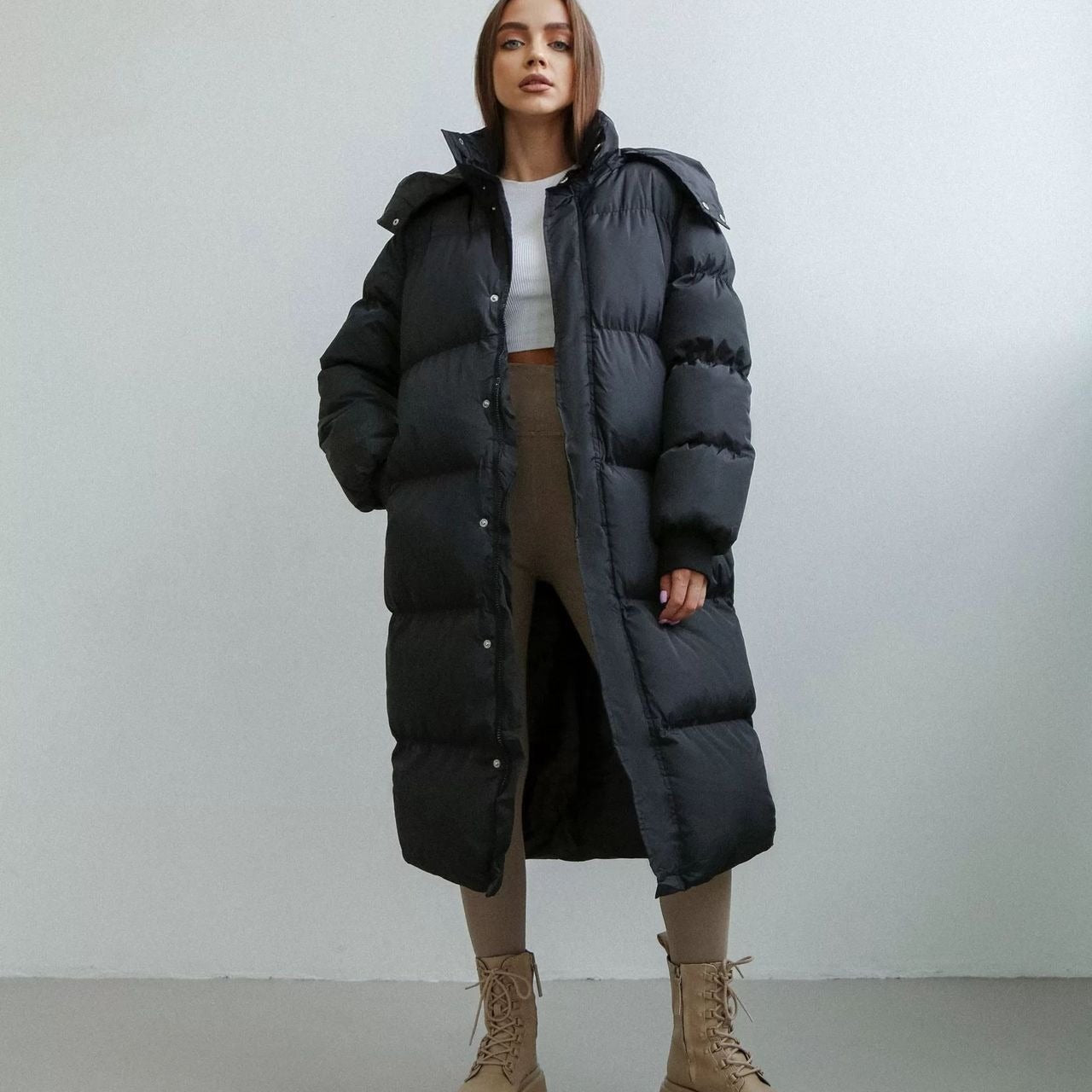 Piumino lungo da donna - Tessuto intrecciato - Vestibilità oversize - Collo alto con cappuccio