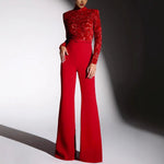 Tuta da donna – pizzo ricamato – maniche lunghe – cintura in vita – gambe svasate