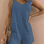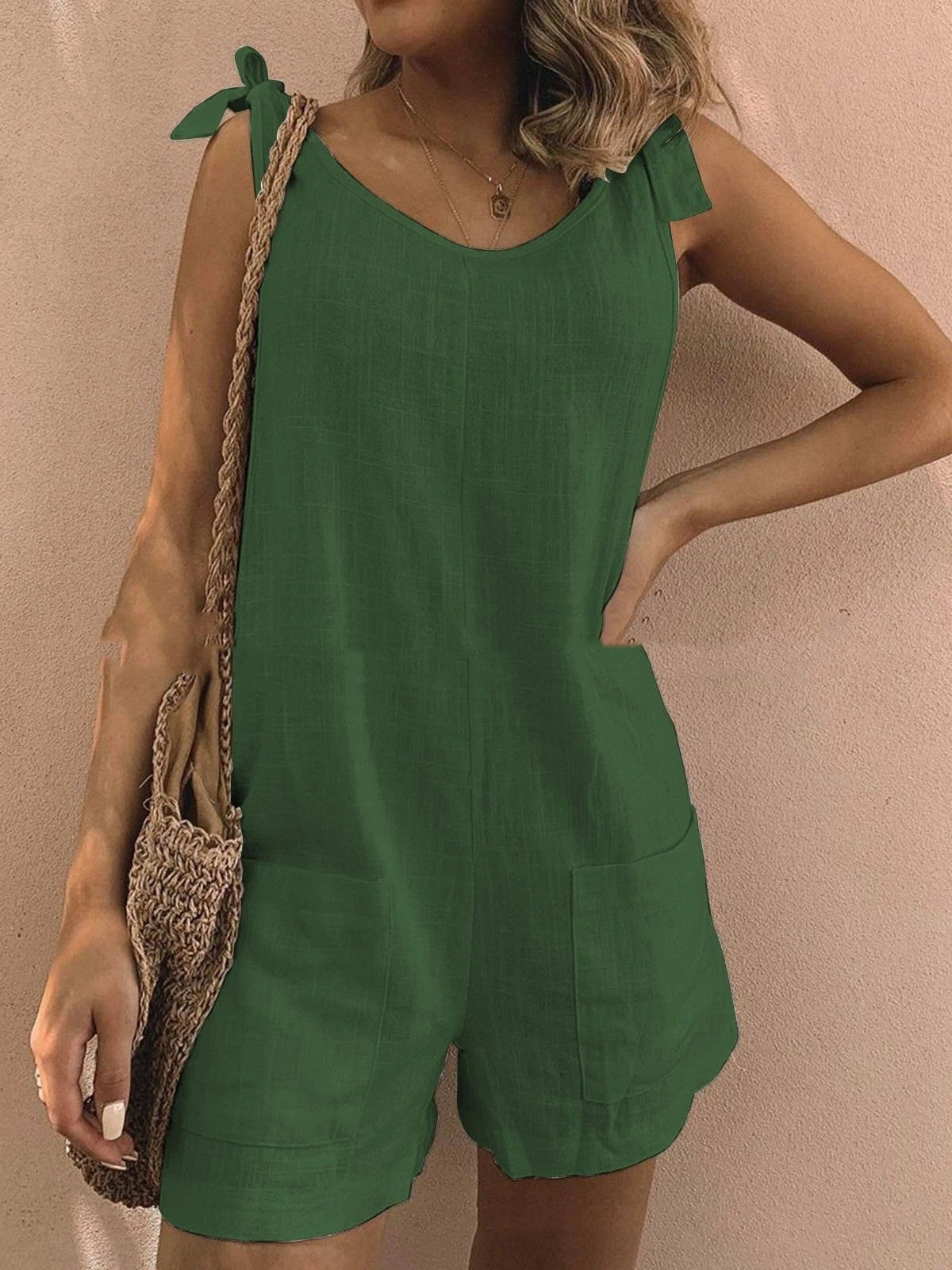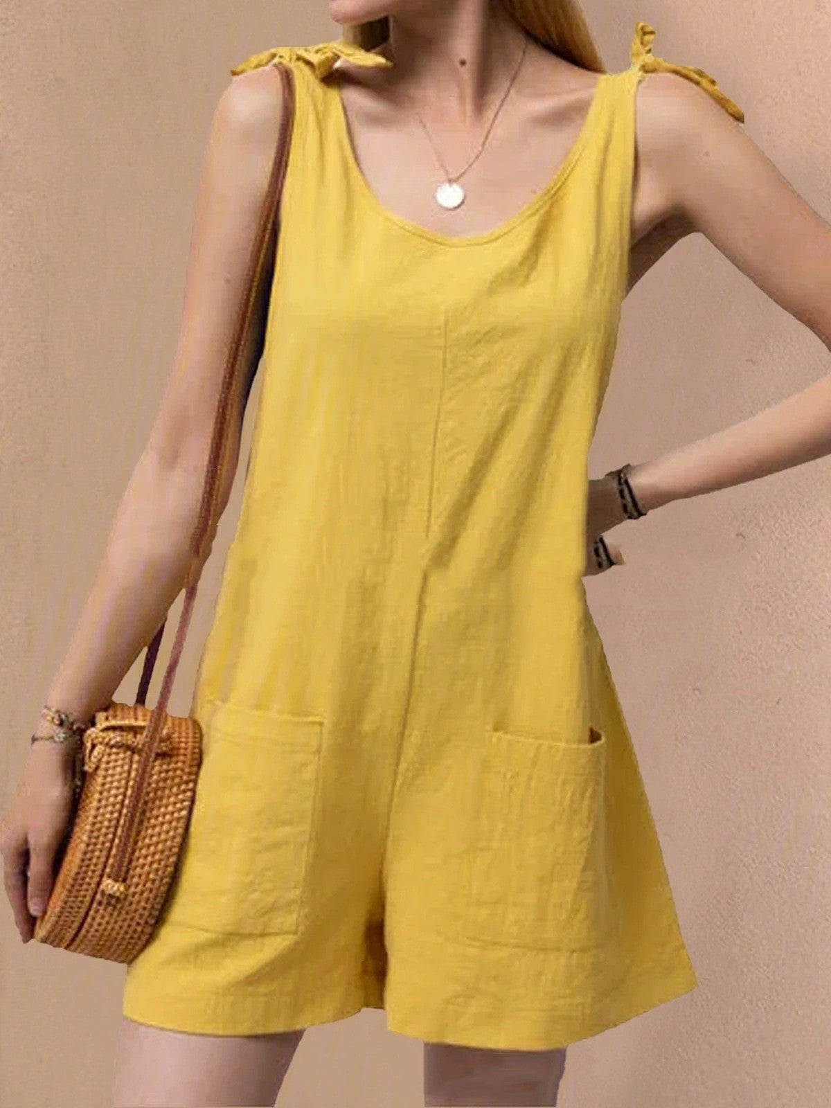 Design: Tuta senza maniche con scollo a barchetta, spalline annodate e tasche applicate sul davanti.
