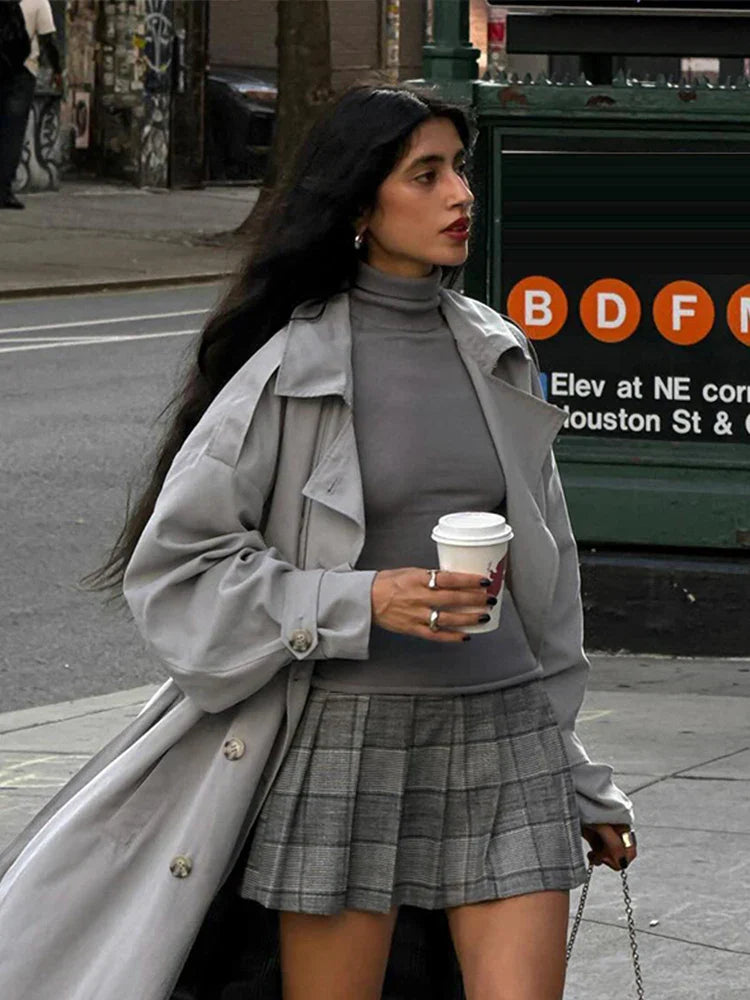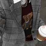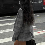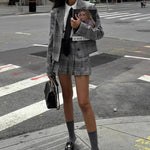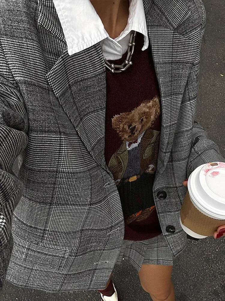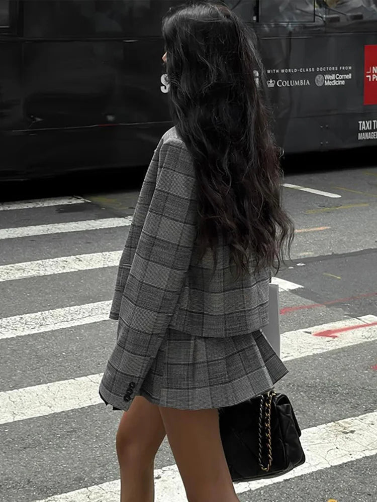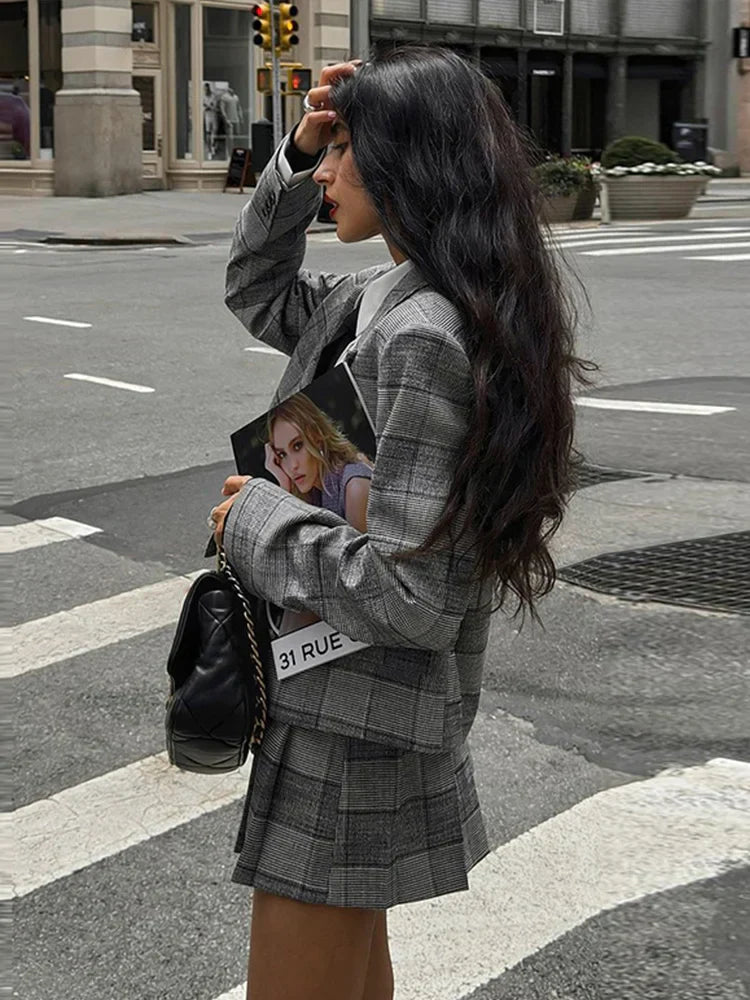 Completo da ufficio in due pezzi con risvolto plissettato e motivo scozzese retrò